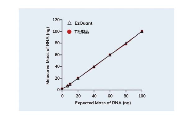 図2 EzQuant RNA HS Quantification kitの感度 EzQuant RNA HS Quantification kitはDNAよりRNAに対して高い感度を有します。本キットを用いて、様々な濃度のDNA、RNAおよびDNAとRNAの混合物をそれぞれ含むサンプル(10μL)を測定しました。 EzQuant RNA HS Quantification AssayはT社RNA HS Assayと同様に優れた直線性を示しました。 |